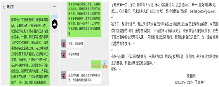 邢艳茹老师说:“疫情从寒冬蔓延至今,我们已经取得了很大成绩,但硬仗还在继续。近两个月来,每每看到新闻,都为身为中国人感到骄傲和自豪。无数次泪湿眼眶,恨不能冲向战场!中国速度在这次疫情中为世界争取了宝贵的时间,我为祖国骄傲!我更为千千万万的白衣天使,默默无闻的工人,环卫,快递小哥,司机感动不已。这次抗击疫情中有非常多90后,我也是90后的一员,作为老师,我会坚守我的阵地,带领学生一起度过难关。待春暖花开,我们再相聚!”