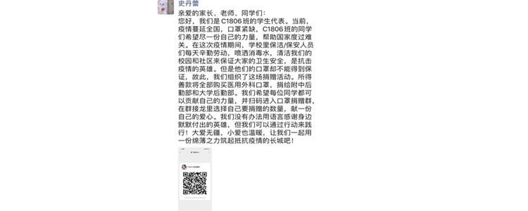 2020年春节期间,全国爆发了来势凶猛的新冠肺炎疫情,口罩急缺,人心惶惶。在这个特殊的时段下,初1806班的七名班委以及班主任范皖晴老师共同策划了这场口罩捐赠活动。这次捐赠的主要对象是皇冠体育官网后勤部门的人员,活动方式是线上捐赠。