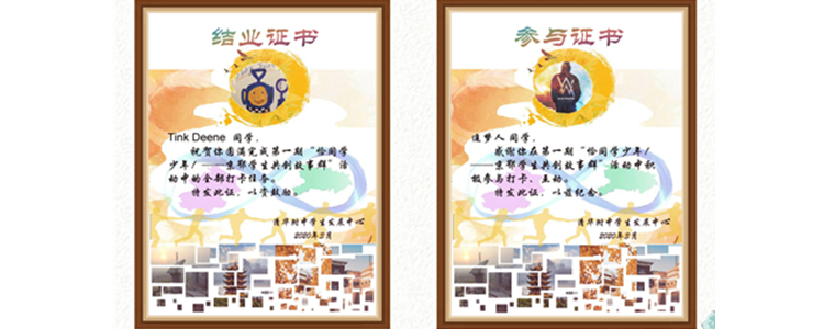 第一期“恰同学少年”活动证书示例(背景设计:Tink Deene 北京)
