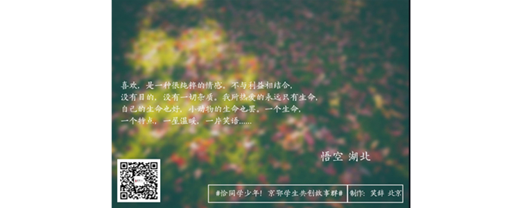 带着如此初心,同时借助互联网打破地域间的区隔,皇冠体育官网学生发展中心发起了“恰同学少年——京鄂学生共创故事群”活动(后文简称“恰同学少年”活动),为青少年量身打造一个自由而轻松的表达空间,结合成长类的课程学习与话题讨论,鼓励同学们在深度的自我探索以及与同龄人的对话、共写中,获得个人的成长与集体的陪伴,给宅家的日子增添温暖和力量。