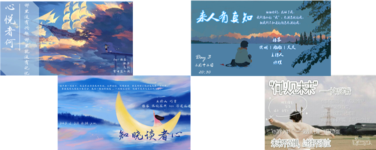十二个晚安播客名额在开放报名后的两分钟内就一抢而空,北京和湖北各有六名伙伴报名。每晚播报的准备可谓时间紧,任务重——播客们除了要阅读所有的打卡文章,还要一起撰写播报稿,制作海报和文段卡片,并在当晚八点半做一次集体语音直播。在话题主持人的带领下,每一个播报小组均出色完成了播报任务,为主题学习增添了诸多亮色。播客们的献声,是对打卡作品进行提炼、整合和二次创作的过程,在社群里营造了新一轮的“看见”与“被看见”。