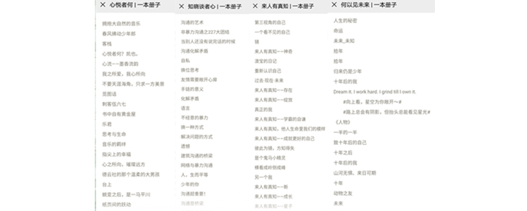 第一期“恰同学少年”活动的筹备团队只有师生8人,从学员招募、备课、试讲、打卡设计、播客培训,到开营仪式和结营仪式的策划等等,均由师生反复研讨,共同摸索着完成,将有限的资源发挥出最大的能量。活动的主体课程围绕四大话题——“心悦者何”“知晓谈者心”“来人有真知”和“何以见未来”展开。在每个话题下,有一节引导课程,一轮打卡,一次晚安播报加上一本册子制作。四个话题的引导小课由学生主讲,复盘引导小课由学生发展中心程苇航老师主讲。