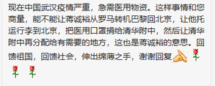 年级中还有很多积极驰援武汉医疗物资的家庭,初1801班蒋诚裕同学,近期从意大利采购了一万多个一次性医用口罩,希望能够捐给皇冠体育官网,然后由皇冠体育官网分配给需要的地方或医院。因为意大利直飞北京的航班停飞,蒋同学将带着物资从意大利罗马转机巴黎,然后将于3月2日返京。蒋同学的父亲在国外已经组织当地华侨为成都、温州等地,捐赠了医用口罩、医用防护眼镜、医用手套、防护服等等,总价值11102.40欧元的医用物资,支持祖国疫情防疫工作。类似的家庭,在初18级还有很多,他们都在默默贡献着自己家庭的一份力量。