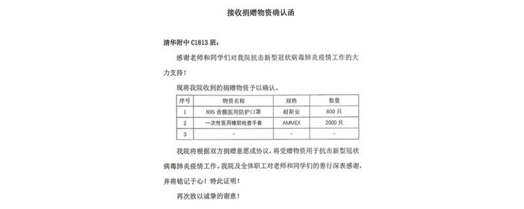 其中,皇冠体育官网“根与芽公益社团”在2月6日得知有热心家长可以购买到医用物资后,在社团指导老师、班主任那妮的支持下,由初1813班宋兆涵同学发起,与肖惠文同学共同负责,在云朵、朱高安、廖一蓬、曹硕、王彦鲁、刘思源、吴征汝等同学的积极响应下,倡议身边的师长、朋友和家人参与募捐,并将所得款项用于采购医用口罩和手套,用以帮助北京一线医护人员抗击疫情。最终,于2月9日晚统计出募集总资金17851.97元,并联系热心家长以成本价购得医用导音N95口罩800个,医用手套2000只。2月10日,宋兆涵同学通过某医院的公告联系了医院物资科,医院方面确认了物资的资质以后,由那妮老师代签了捐赠协议,并于2月12日将800个口罩和2000只手套递送到了医院,用于一线抗疫。医院物资科的医生代为转达了医护人员对参与此次捐助的爱心人士的诚挚谢意!