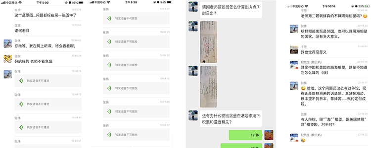 在这期间,地理组涌现了很多感人的事迹:刘景奎老师与姚佳老师微信开展集体备课每次时长超过一个小时,常常备课到凌晨3点,为力保及时解答学生的困惑,凌晨微信答疑都是常见的;张伟老师和王宝琴老师随时随地线上为学生答疑,每一条语音都寄托了老师对学生的殷切期望,张伟老师说到:“答疑的过程真的是教学相长,与学生讨论的问题,有的饶有趣味,有的细致入微,有的是高频题点,虽不能见面,但是能感觉到他们很努力、自律,这一代人,出生于非典,备考于肺炎,但是,只有与国家共患难,才能真正使养尊处优的少年成长为有责任担当的国家栋梁!”;谷丰老师和王宝琴老师身在国外,克服时差困难,高效高质做好教研和答疑工作;高昕老师和唐秀梅老师1月26日便开始着手准备录课,期间线上答疑,课程讲解不间断,常常工作到深夜,唐秀梅老师为学生手写了信件,鼓励学生在初三这样一个重要的时期,自觉学习,完善自我,争取更好的成绩,同时唐秀梅老师还收到很多学生们的反馈,“老师辛苦了!”“老师注意休息!”“老师您练练颈椎”学生们的进步和温暖话语是我们前进的最大动力;伊娜老师面对初二新中考形势,重新构建知识框架,带领初二备课组一周至少进行两次30分钟以上的集体备课,精心准备微课和练习题,力求在线上教学中带领学生逐一攻破知识难点;李慧蕾老师、施晴老师、赵习老师、周小康老师在视频微课中也收到了来自学生弹幕的鼓励与喜爱。