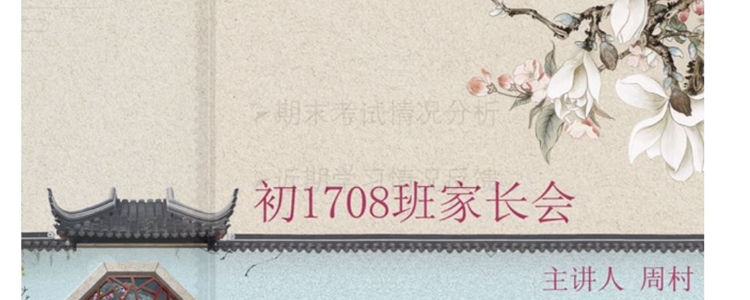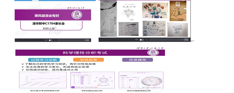 初1713班:主题是“传家国情怀,促学习发展”。分三个部分:有效态度、成绩分析和学科介绍。在特殊时期培养学生关注社会、增强社会责任感。同时,面对所处的网络信息时代,关注学生所处的网络生态,引导学生正确理性对待网络信息。最后,结合第一次班会作业内容,选出优秀作品制作视频穿插在家长会视频中,更好地体现学生在疫情期间所表露出的家国情怀。