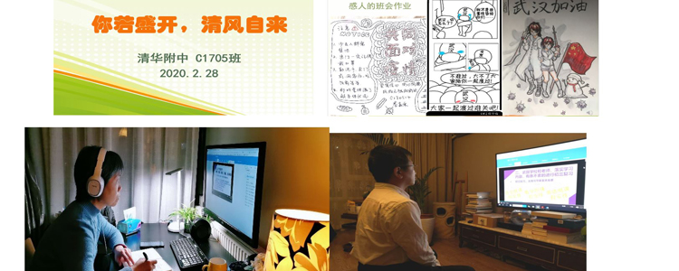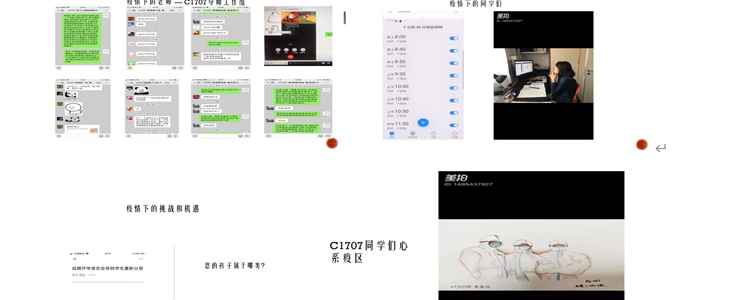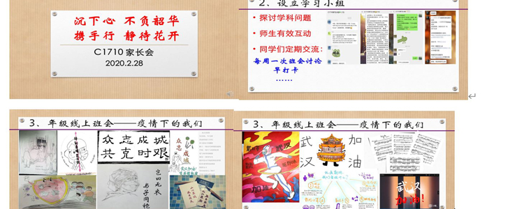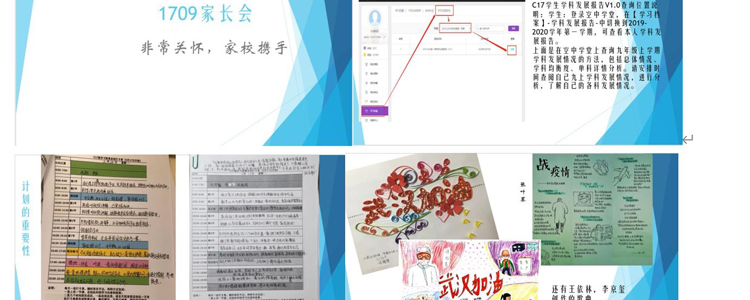 初1707班:一、以“疫情下的老师们”、“疫情下的同学们”、“疫情下的家长们” 三个版块构成“疫情下的我们”这条主线,向家长分别介绍了班级工作组、班级导师工作组、学习小组等班级活动的开展情况。二、“疫情下的机遇与挑战”版块以一篇名为“延期开学肯定会导致学生重新分层”的文章引导家长和学生意识到备考时间的紧迫性以及自制力对中考成绩的重要性,并将自我管理有方的同学经验分享给家长。三、采用音乐短片的方式展示学生在家的学习和生活状态。