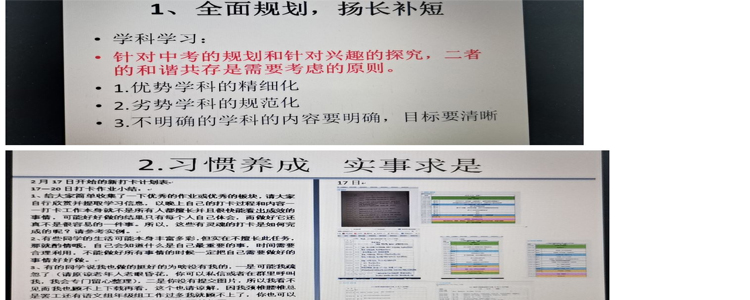 初1714班:从期末成绩分析,学生自身发展趋势,网络学习的利与弊,科任老师给出的自主复习策略四个方面展开。让每个同学正确认识自己的优势与不足,从而在自主学习的过程中有所侧重,突破瓶颈。再用武侠小说中的“闭关修炼”鼓励同学,只有心无旁骛,专注于一,方能在出关之时功力大涨,驰骋江湖。初中孩子自主学习阶段更需要老师们密切的关注。老师们会一直陪伴学生“闭关修炼,得悟大道”。
