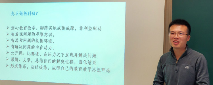 随后,李玉国老师介绍了自己主持的关于尖子生培养研究的课题,他介绍了课题的由来,阐述了当前尖子生培养中的一系列问题,诸如注重刷题却不注重能力、尖子生培养策略不够清晰等等,并且仔细介绍了课题的研究内容和方向,为青年教师的发展提供了平台机会。