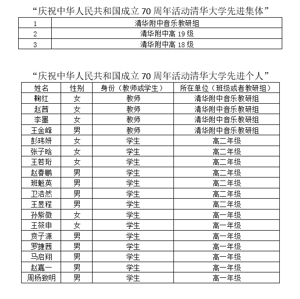 清华大学校长邱勇宣读《关于表彰庆祝中华人民共和国70周年活动清华大学先进集体和先进个人的决定》。附中音乐教研组、高18级年级组、高19级年级组荣获“庆祝中华人民共和国成立70周年活动清华大学先进集体”称号,鞠红、赵茜、王金峰、李墨老师和彭玮妍、周杨致明等14位同学荣获“庆祝中华人民共和国成立70周年活动清华大学先进个人”称号。鞠红、赵茜、王金峰、李劲松老师分别作为代表上台领取荣誉奖牌。