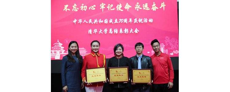 鞠红老师(左1)代表先进个人领取“庆祝中华人民共和国成立70周年活动清华大学先进个人”奖牌