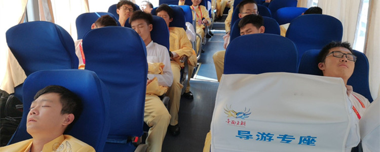 在车上抓紧时间休息的同学们