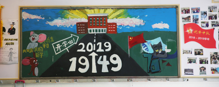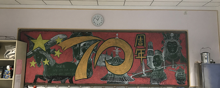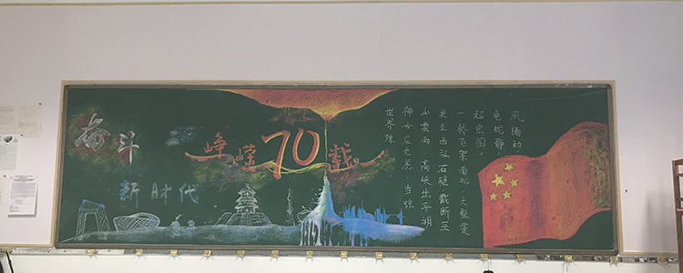 为热烈庆祝新中国成立70周年,9月校团委组织全校各班开展“班级空间文化评比”活动,其中包括“峥嵘七十载,逐梦新时代”主题黑板报设计,要求各班后黑板板报内容要以“我和我的祖国”、“峥嵘七十载,逐梦新时代”、“我为祖国点赞”等突出国庆热烈氛围的主题展开设计。经过一个月的筹备和设计,初高中各班都完成了板报绘制工作。