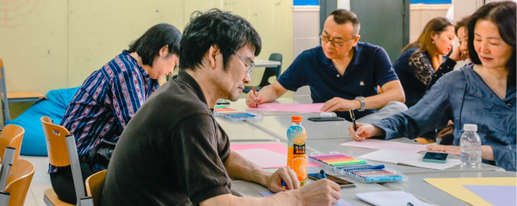 中学部的课程说明会分为两部分:由班主任主持的班级活动,以及由任课老师主导的课程介绍。在班级活动中,各班班主任设计了个性化的内容,有的班级介绍了本班学生的团队建设活动、有的班级邀请家长体验“部落教学”课堂,还有的班级给家长分发了彩纸和笔,请他们写下十年后想对孩子说的话。
