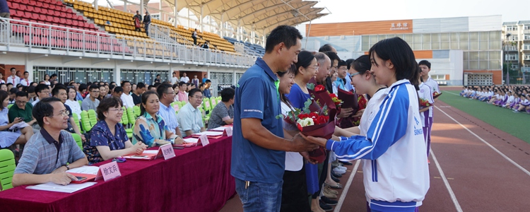 学生代表向教职工代表献花,表达对辛勤工作在学校各个岗位的教职工的感谢。在过去的一年中,附中的老师们默默奉献、努力耕耘,为学校的发展和每一名学生的成长,付出了辛勤的汗水。