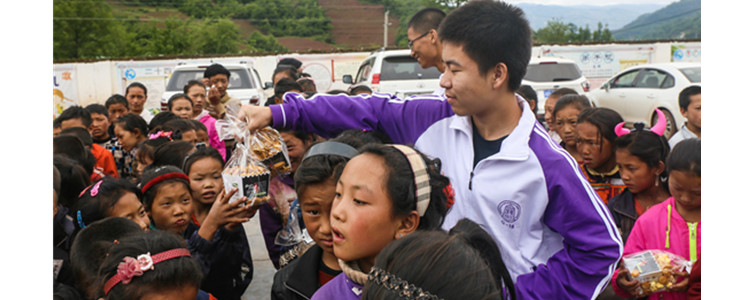 支教团同学协助“风雨同舟公益”志愿者为当地孩子分发点心