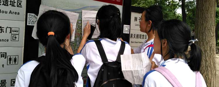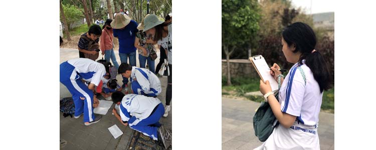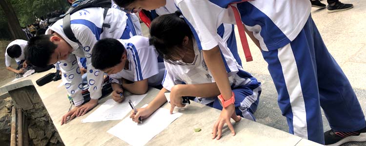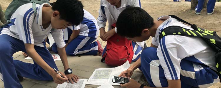 “走进圆明园“定向越野活动以小组单位进行,每个班分为7个小组,每个小组由4-5人构成。每个小组的同学们通过解答数学题的方式获得各个任务点的坐标,从而得到任务点在地图上的位置,并进行寻找。到达任务点后,需要完成一系列的任务,包括盖章,合影,与工作人员配合完成任务等多样的形式。