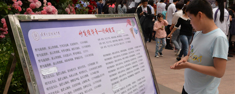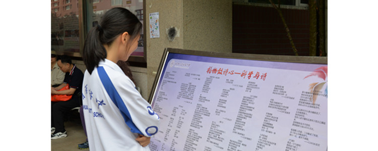 在展板和诗词续写的答题区域,同学们正在现场续写诗歌。荟萃的诗词是中华民族自古以来传承的特色,也是民族文化的重要组成部分,在进行诗词续写的同学冥思苦想,最终交上了很好的答卷。旁边的“科学与诗”展板正在展出学生节前各班创作的与科技相关的诗作,对我国未来科技的发展寄予厚望。