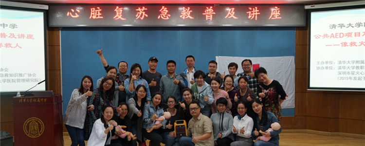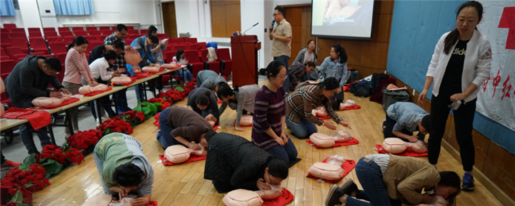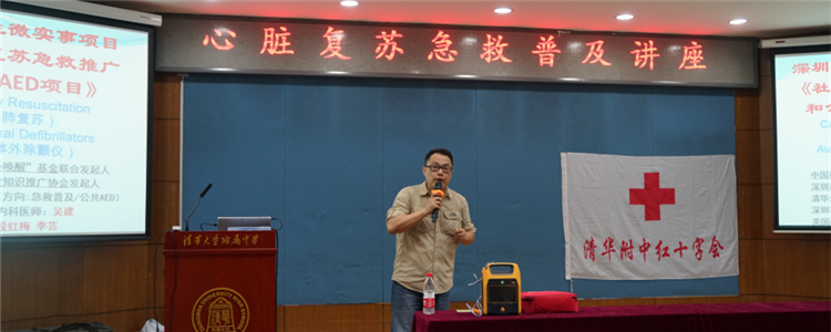 吴建老师作为清华大学公共管理硕士,主要研究急救普及和公共AED(用于心肺复苏的自动体外除颤器)项目。吴老师的培训分为理论讲授与实操演练两个部分。在22日的培训中,吴老师首先向学员介绍了AED的使用方法和心肺复苏技巧,着重讲授了创伤包扎、防灾减灾、急救生命链等基础急救知识。