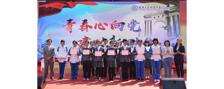 校领导为新团员佩戴团徽、颁发团员证