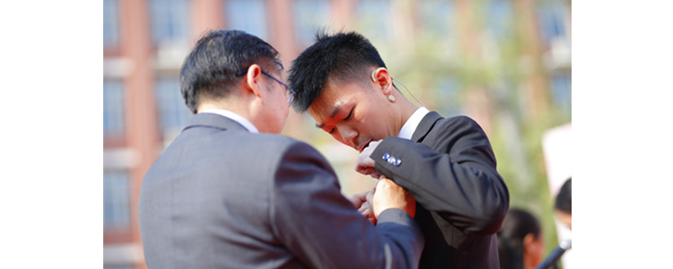 到场的校领导们为学生代表佩戴成人纪念徽章,把期望和希冀凝聚在小小的徽章里,希望他们不忘初心,追梦不息。