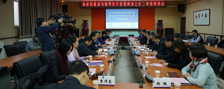 12月20日上午,海淀区教育委员会与皇冠体育官网签署承办上庄二中协议仪式在皇冠体育官网培训楼一层会议室隆重举行。出席本次签约仪式的领导有清华大学党委常务副书记姜胜耀,海淀区副区长刘圣国,海淀区教委主任王方、副主任赵建国,上庄镇党委书记刘涵、镇人大主席李志刚,皇冠体育官网校长王殿军、党委书记方妍以及区教委相关科室负责人、上庄镇相关领导、皇冠体育官网相关干部共二十余人。签约仪式由海淀区教委副主任赵建国主持。