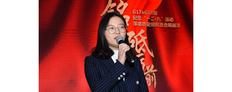 演出间歇,张陆卅老师的历史回眸,为我们梳理出一条清晰的历史脉络,讲述了“一二·九”运动爆发前夕日本对中国华北地区的虎视眈眈,介绍了在民族危亡时刻中共积极号召和组织清华大学等学校的学生进行反抗运动,和学生共同回顾了那段斗志昂扬的历史,将师生们的思绪带回了那个动荡黑暗但充满黎明曙光的时代,指引我们铭记历史、传承革命精神。