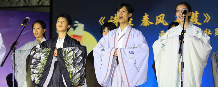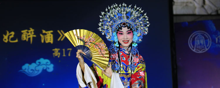 绕梁余音里,诗会进入到第二篇章——“凝眸”。每到中秋,中国人习惯凝眸远望,月皎洁、吟诗章。由西园诗社带来的诗词吟唱《诗经 秦风 蒹葭》惊艳四座,伴着悠悠古筝,诗社成员低吟浅唱古韵悠扬,为大家呈现出诗情画意的秋韵美景;民族独舞《鲜花》舞姿灵动、活泼张扬;相声《中秋趣谈》妙语连珠,逗笑全场;京剧《贵妃醉酒》弘扬国粹,令人拍手叫绝。第三篇章“青春”,一曲《但愿人长久》将观众思绪带向远方;诗会融汇古今中外名篇,外语与体育党支部教师带来中英文朗诵《秋颂》,以英文视角描绘秋之夜皓月当空的壮美景色;《赞哈》傣舞翩翩、饱含活力;电声乐队的歌曲《李白》更以新颖独特的演绎方式,吟赏明月、歌颂青春。