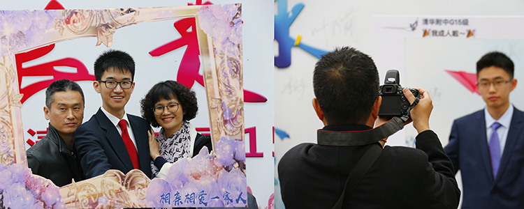 本次成人仪式的第一项内容是“七彩成人路”,成人路分为三个板块——“暾出扶桑”儿时照片展,“邅道昆仑”高中三年活动照片展,“凤翼承旂”各类寄语展示。衣着正式的家长和身着正装、已有了大人模样的学生们也热情的在入口处的展板那里拍了照片,学生们眼神中带着少年的无畏和青年的沉稳,家长们的眼中则夹杂着对孩子的现在的欣慰以及对孩子的过去的怀念这些多样的情绪。许多家长都表示,这张合照他们一定要永久珍藏。