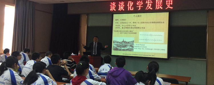 随后,帅教授深入浅出地介绍了我国的化学发展史,讲述了铜的冶炼、铁的使用、中药的研究、火药的成分以及陶瓷的发展。这当中不仅涉及了许多中国古代文化,还点明了其中所蕴含的科学道理以及中国为世界化学的发展做出了巨大的贡献。同时,帅教授也提到了“李约瑟难题”:中国古代科技如此发达,为何到了近代,我国的科学技术就落后了很多呢?在对这一问题的反思中,帅教授鼓励附中的学生们好好学习,将来走上科研岗位后要做原创性的科学探究,为祖国为世界的科学发展贡献自己的力量。