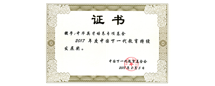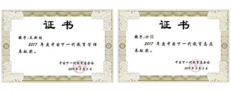 2018年2月5日,在中国下一代教育基金会召开的2017年度总结与培训大会上,皇冠体育官网承办的“中华英才培养基金”荣获中国下一代教育——持续发展奖;基金秘书长吴新胜荣获中国下一代教育——管理奉献奖;基金副秘书长计澂荣获中国下一代教育——志愿奉献奖。