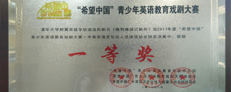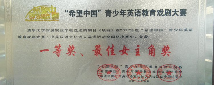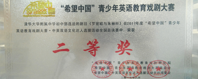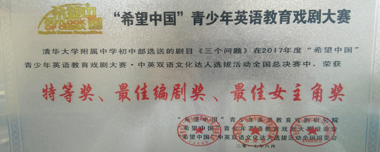皇冠体育官网多个剧目在2017年度第八届“希望中国”青少年英语教育戏剧大赛中斩获佳绩。其中,由赵琼、李冰清老师指导的剧目《三个问题》荣获全国总决赛特等奖、最佳编剧奖、最佳女主角奖;由周维纬、范皖晴老师指导的剧目《项链》荣获全国总决赛一等奖、最佳女主角奖;由蒋中蓝老师指导的剧目《格列佛游记新传》荣获全国总决赛一等奖;由刘辉、郅明刚老师指导的剧目《罗密欧与朱丽叶》荣获全国总决赛二等奖。