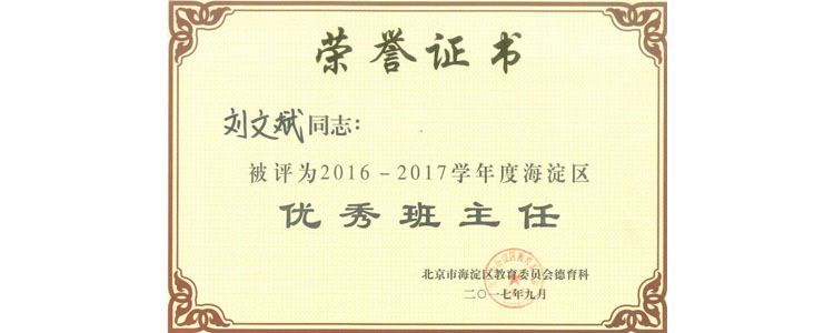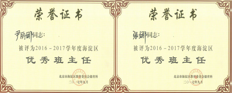 10月11日,2016-2017学年度海淀区“优秀班主任”评选结果揭晓,皇冠体育官网刘文斌、邱磊、王歆、武晓青、张河桥、尹丽娜、张娜7名老师获此殊荣。