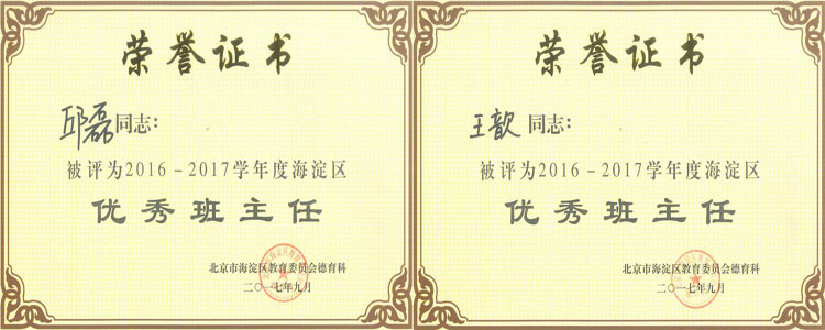 邱磊、王歆老师“优秀班主任”荣誉证书