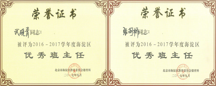 武晓青、张河桥老师“优秀班主任”荣誉证书