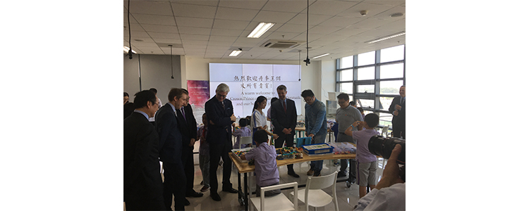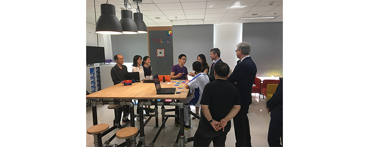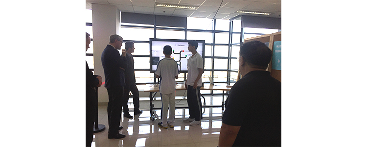 2017年9月24日上午,在清华大学终身学习实验室,皇冠体育官网创客空间、高研实验室的学生李雅轩、刘健坤、左思青、谈恺辰向丹麦王储展示了其创新作品,获得了一致好评。