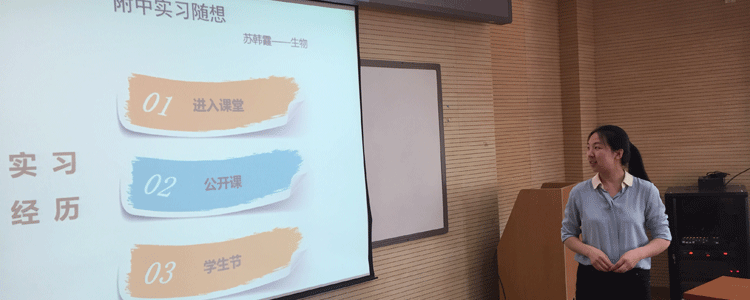 英语学科新教师江雨薇从听课、讲课、学生活动和心得体会四个方面讲述了自己的实习经历。她表示附中给学生提供了丰富多彩的校园生活,真正实现了学生素质的全面发展。她还谈了自己的心得体会,新教师首先应该进行角色转换,把自己从学生转换为一名教师。