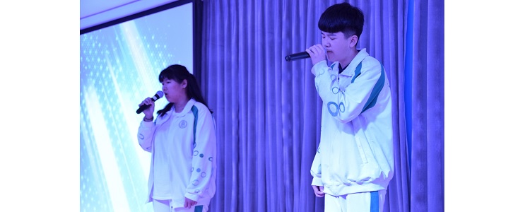 决赛中“你唱我猜”互动环节,由教师哼唱歌曲,选手围话筒站好,当猜到歌曲名称时,选手抢话筒说答案。朱建宏校长哼唱的曲目是《我亲爱的爸爸》,恰逢本周日父亲节,也向各位学生的爸爸送去祝福。程惠云副校长哼唱的曲目为Red River Valley,标准的发音、优美的歌声,为选手加油打气。另外,党文萍老师哼唱的《爱要坦荡荡》和贺清灿老师哼唱的《十年》,选手争先恐后抢答,带来一些趣味性,也让选手放松了心情。