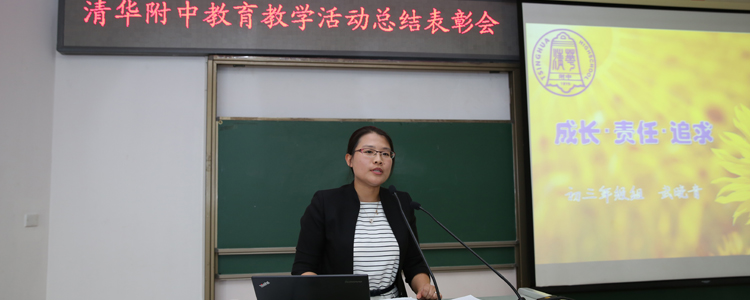初三年级班主任武晓青代表参加班主任基本功展示交流活动的教师作题为“成长·责任·追求”的发言。武晓青老师介绍了自己在班主任工作中的成长经历和感悟感受。她谈到,“负责任的爱,需要科学与理性”,在班主任工作实践中逐渐懂得要“作为班主任,要做学生的‘引领者’,而非简单的‘抱持者’”。
