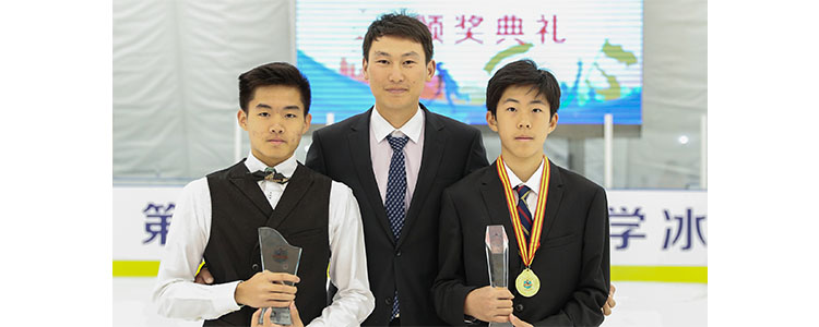 附中冰球队队长王睿(左)、本届最佳球员Thomas Huang(右)、主教练李泽亚(中)代表参加颁奖典礼
