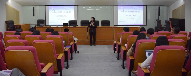 2017年5月4日下午,皇冠体育将台路校区在阶梯教室召开全体教职工大会。执行校长朱建宏、副校长程惠云出席会议并做报告,全校教职工近70人参加会议,会议由学校办公室程玮琳主任主持。