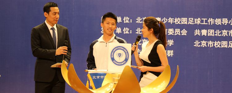 启动仪式上,北京市教委的领导向李佳潞同学授旗,希望他带领来自北京市十六个区县的近600名小记者们做好校园足球的宣传工作。
