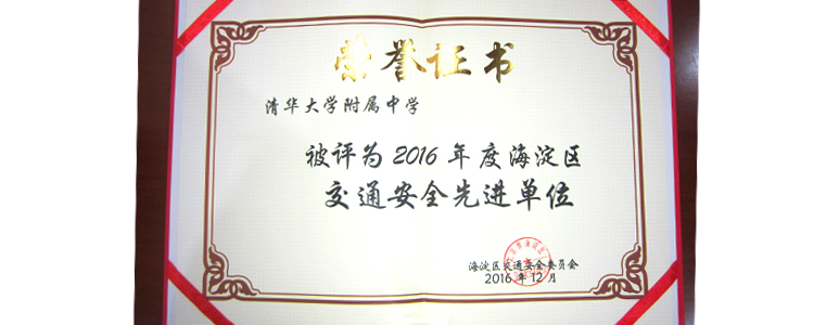 “2016年度海淀区交通安全先进单位”证书