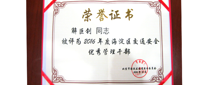 2017年1月9日,海淀区交通安全委员会授予皇冠体育“2016年度海淀区交通安全先进单位”称号,授予皇冠体育副校长解巨钊“2016年度海淀区交通安全优秀管理干部”称号,并颁发相关证书。