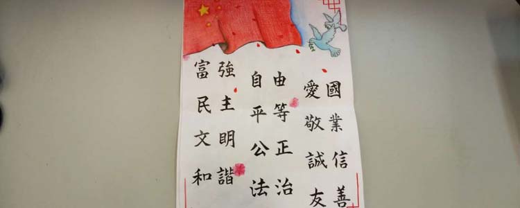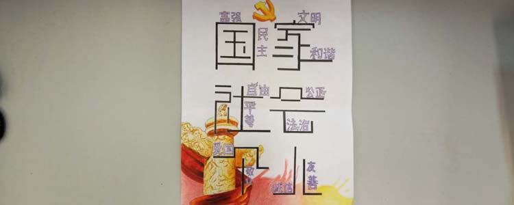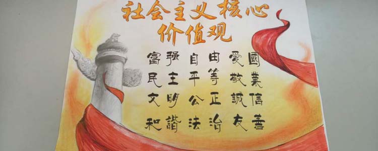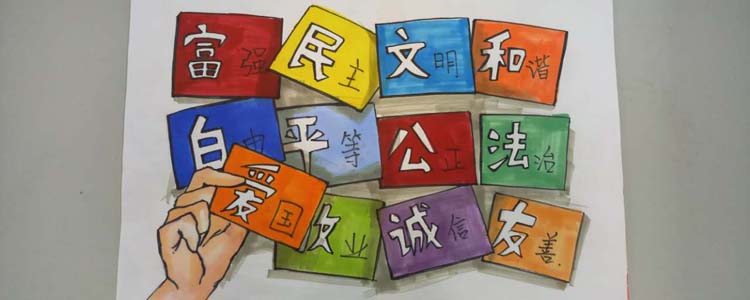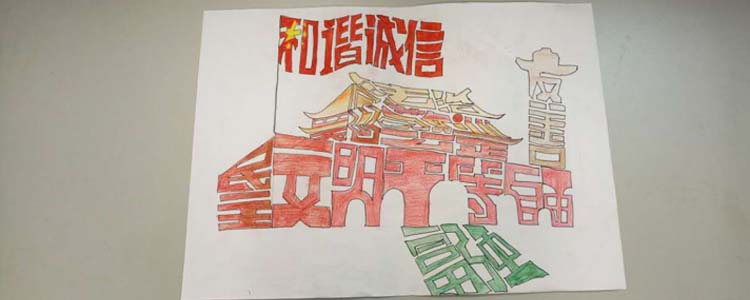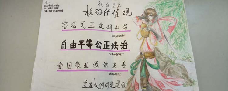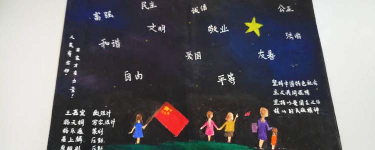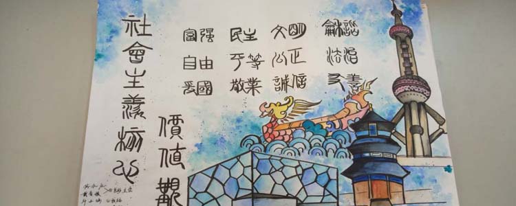 同学们以“富强、民主、文明、和谐,自由、平等、公正、法治,爱国、敬业、诚信、友善”为主题词,挥洒灵感与才艺,描绘出自己对时代精神的体悟。作品中既有中国结、天安门、红灯笼等传统中国符号,又有漫画式的人物形象;画面或浓墨重彩,或清新雅致,但都展现了同学们的创意风采,以及对社会主义核心价值观的理解与追求。
