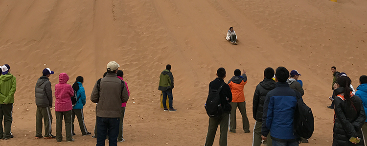 进入沙漠区,骆驼连成一队,卧踞栏中。在领驼人的指导下,同学们依次跨上驼背,思绪随着驼铃的清鸣,开始没有牵挂的飞扬。为了体验中卫人民固定流沙夯土,学生们跟着导师亲手扎了一方麦草方格。乘车回到沙坡头,兜一块滑沙板,顺沙坡急奔而下至坡底,好不痛快!