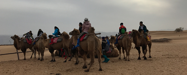 学生们跨上驼背行走在沙漠中