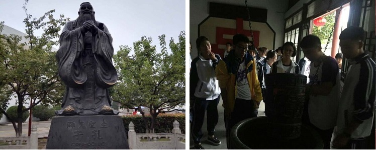 孔子雕像(左) 学生探究学习孔子故里“新奇”事物(右)