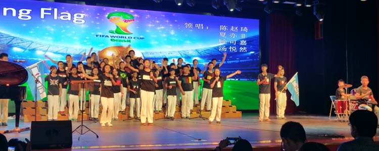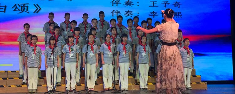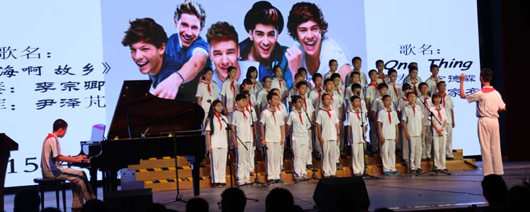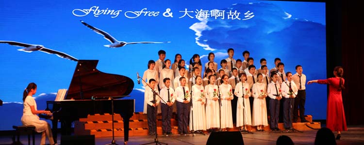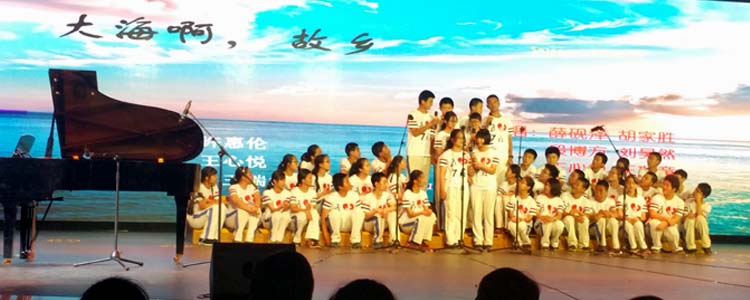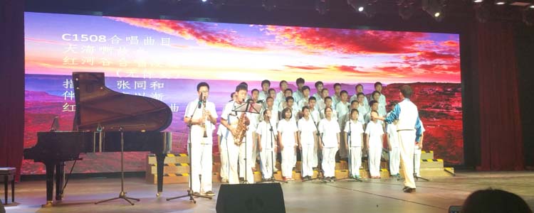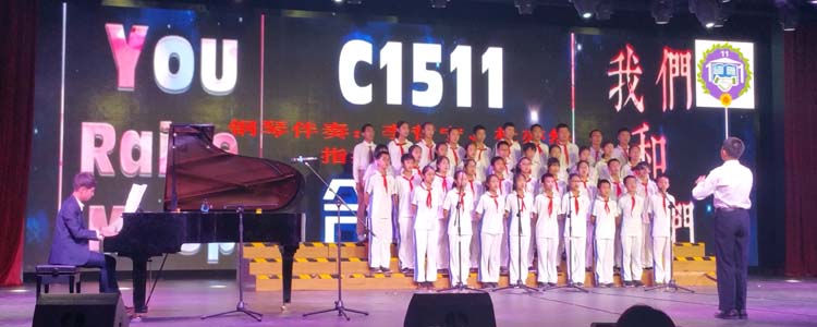 接着,14个班级按照抽签顺序依次演唱:有深情款款的《大海啊,故乡》,有激情澎湃的《Waving flag》,有欢快跳跃的《铃儿响叮当》,更有自己改编的《Song Red River Valley》。各班的演出不仅曲目多样,更有着舞蹈、朗诵、萨克斯、架子鼓伴奏等多种表现形式。异彩纷呈的演出,引来全场阵阵掌声,获得前来观赛的领导和家长的一致好评。