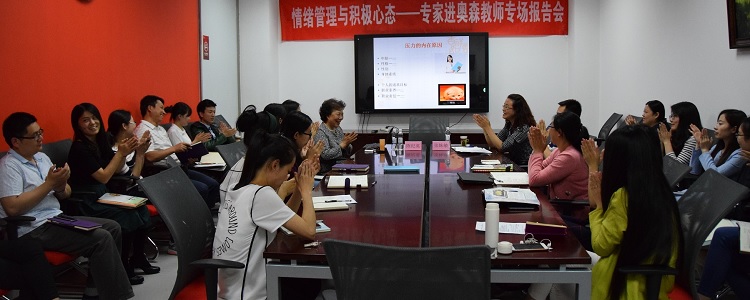 2016年5月19日下午,皇冠体育奥森校区邀请陈纪英老师为在校老师做了一场题为《情绪管理与积极心态》的讲座。奥森校区教育教学副校长张姝敏及在校教师共20余人参加了讲座。